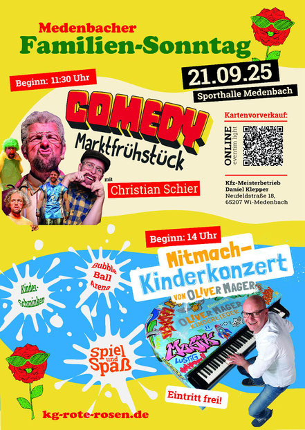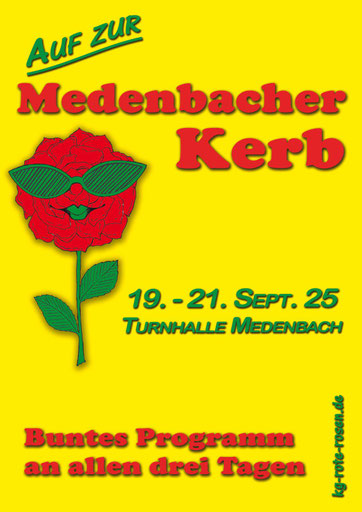 Vom 19. bis 21. September 2025 lädt die KG-Rote-Rosen Medenbach zur traditionellen Kerb in die Turnhalle und auf den Kerbeplatz ein. Euch erwartet an allen drei Tagen ein buntes Programm mit Musik, Spaß und Unterhaltung.